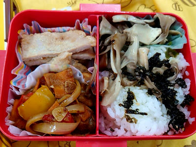 豚の味噌漬け、野菜のトマトにんにく炒め、マイタケ炒め、ザバン海苔、白米。