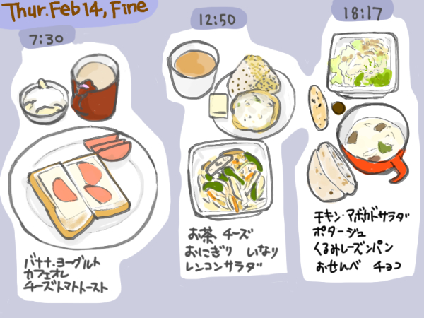 バレンタインなので、ちょっとフンパツして、デパ地下でケーキ、チョコ、ヒレカツ、パン、サラダ、おにぎり、と主食、オカズ、デザートまで買い揃えたら、5000円超。